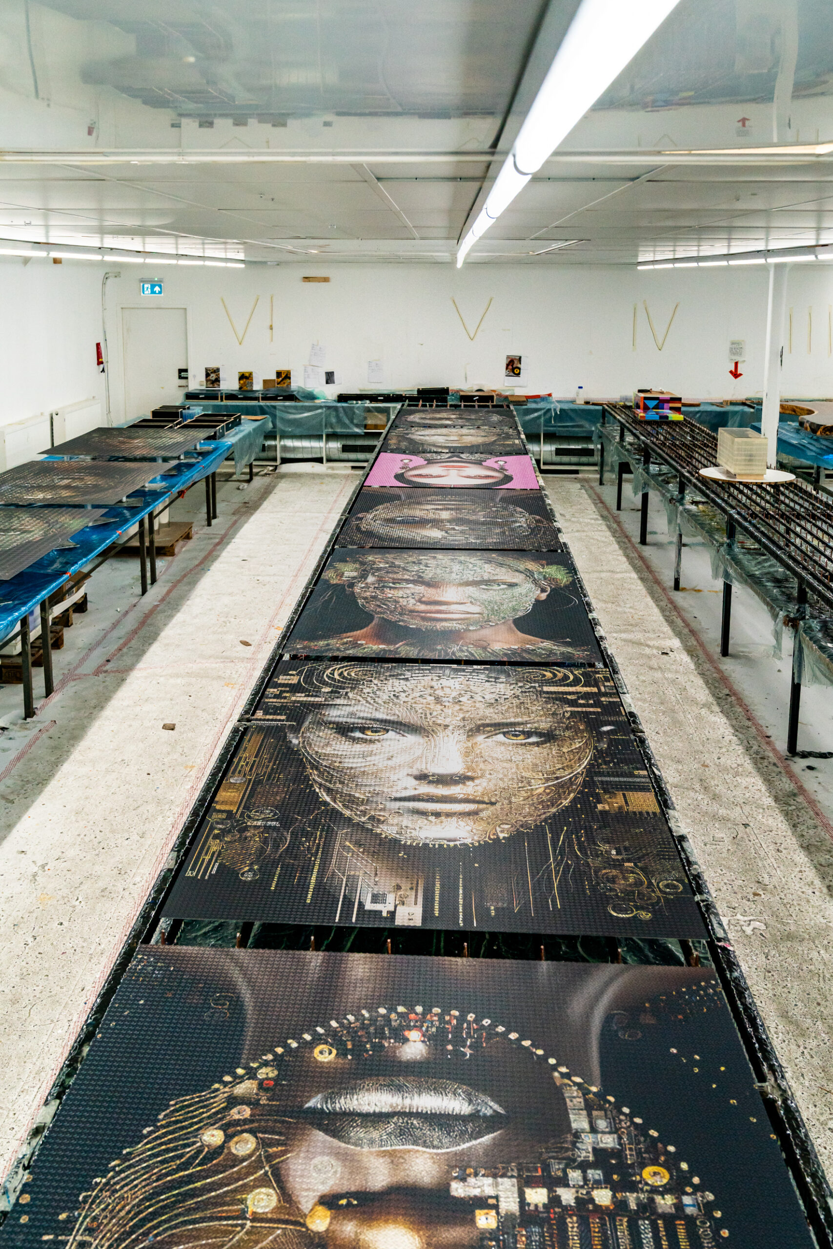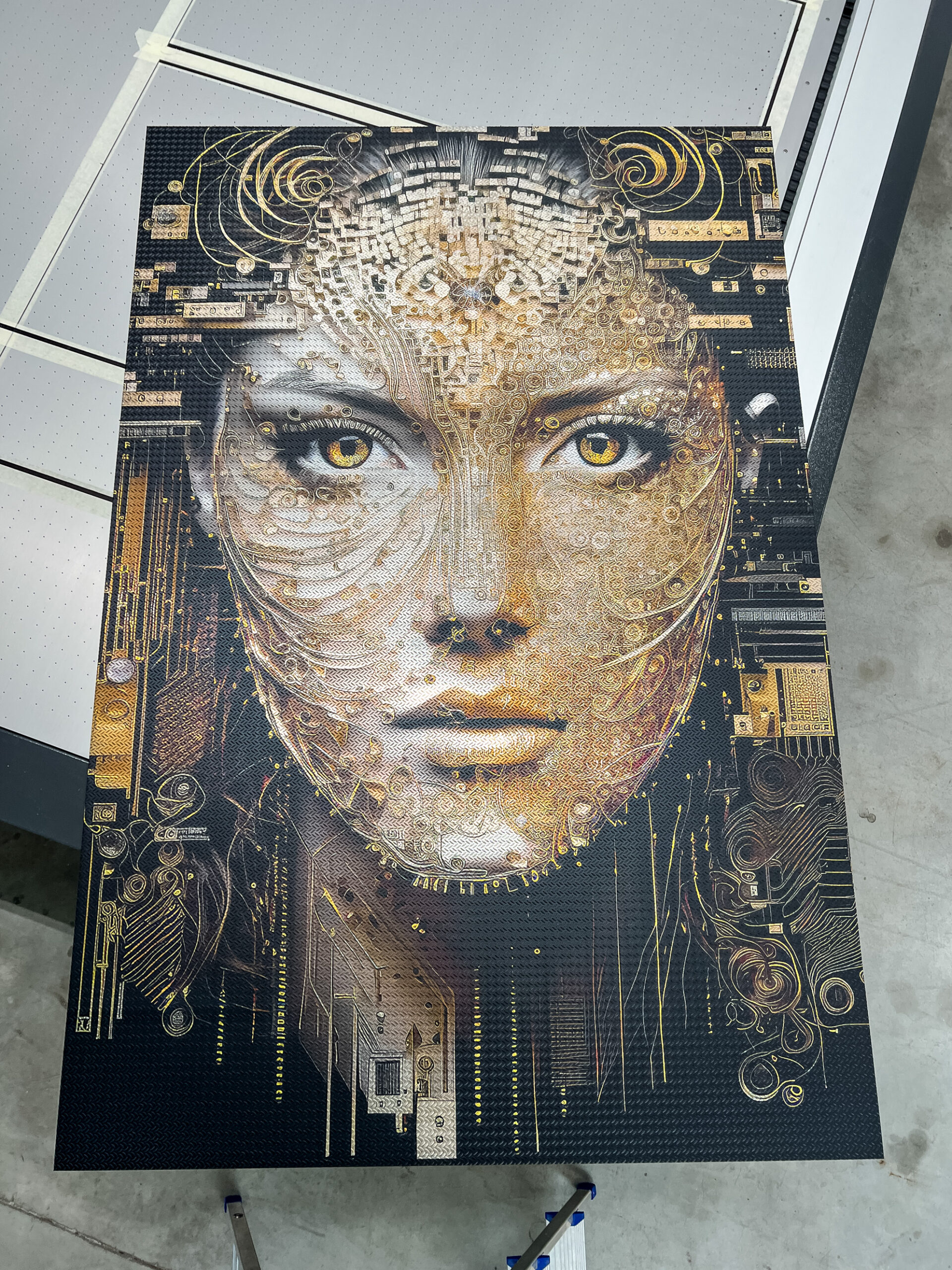 As Akira adorns your wall, delicate green leaves cascading around her form a harmonious convergence of the organic and the digital, evoking a sense of balanced unity. The checker plate aluminum substrate adds dynamic texture to the artwork, enhancing the interplay of design and materiality. Raats’ meticulous detailing, particularly evident in Akira’s skin, showcases unparalleled skill and attention to detail, offering viewers a truly immersive and breathtaking experience.