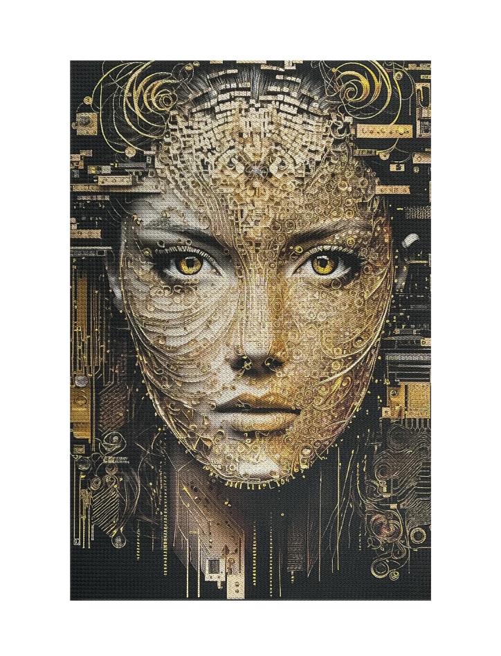 The design of the artwork seamlessly merges Artificial Intelligence with Raats’ unique studio techniques, resulting in a captivating portrayal that defies conventional boundaries. Dubbed an “Eco-Tech Enchantment,” Akira’s portrait intricately blends the organic elements of nature with cutting-edge technological innovations. Vibrant green hues embody her profound connection to the natural world, while a high-tech circuit board design adorns her captivating visage.