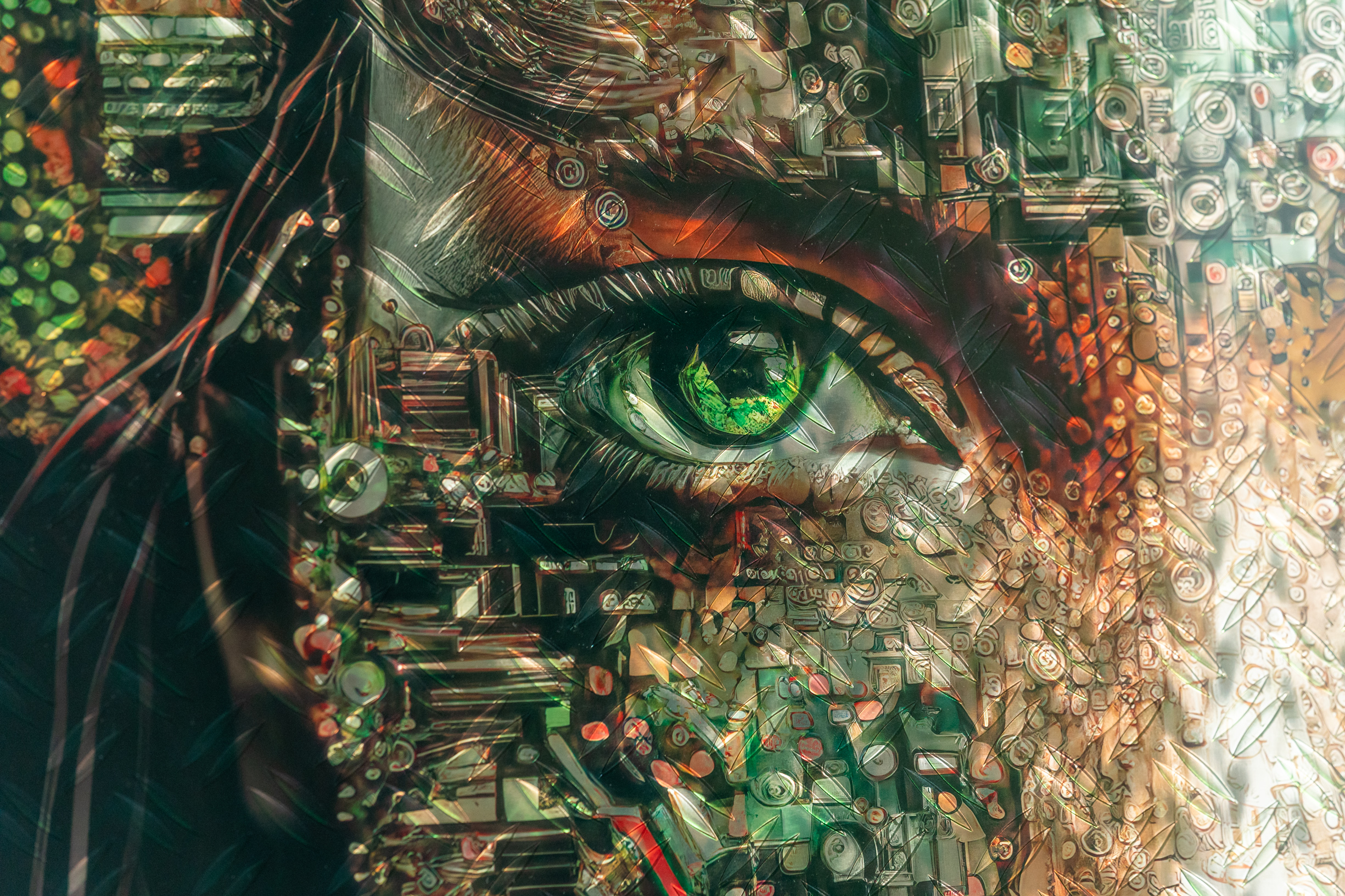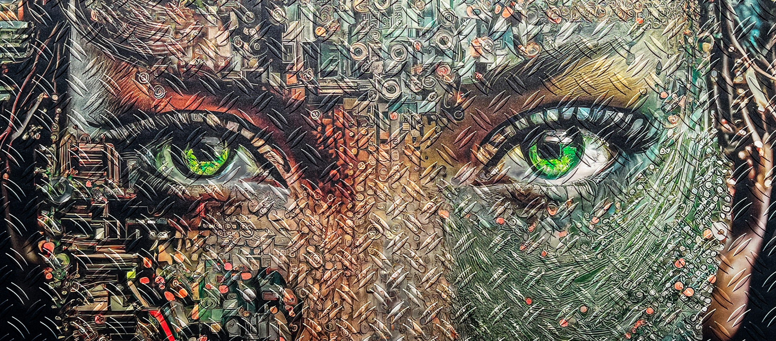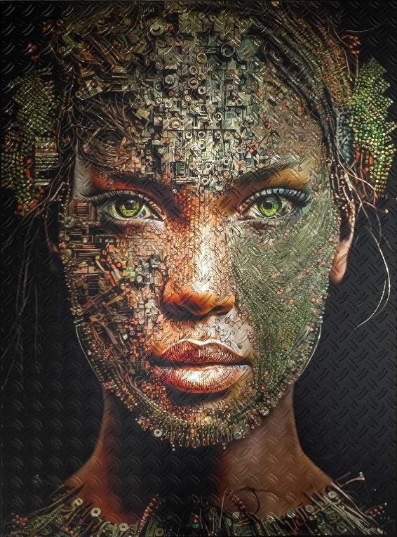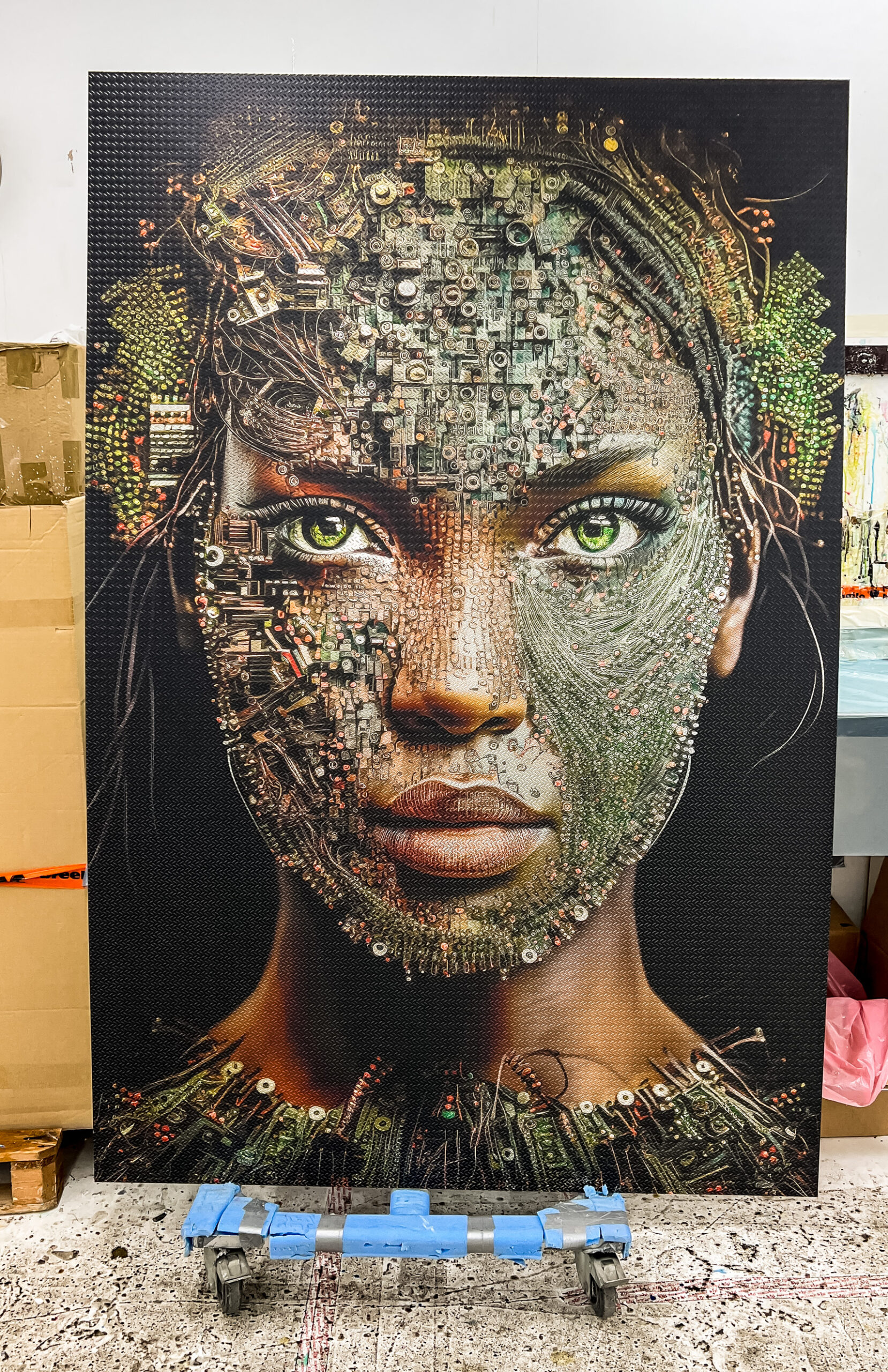 The artwork’s design is a masterful blend of Artificial Intelligence and Raats’ unique studio techniques, resulting in a mesmerizing portrayal that transcends traditional boundaries. Described as an “Eco-Tech Enchantment,” Ayana’s portrait intricately intertwines the organic elements of nature with the cutting-edge innovations of technology. Vibrant green hues symbolize her deep connection to the natural world, while a high-tech circuit board design adorns her captivating visage.