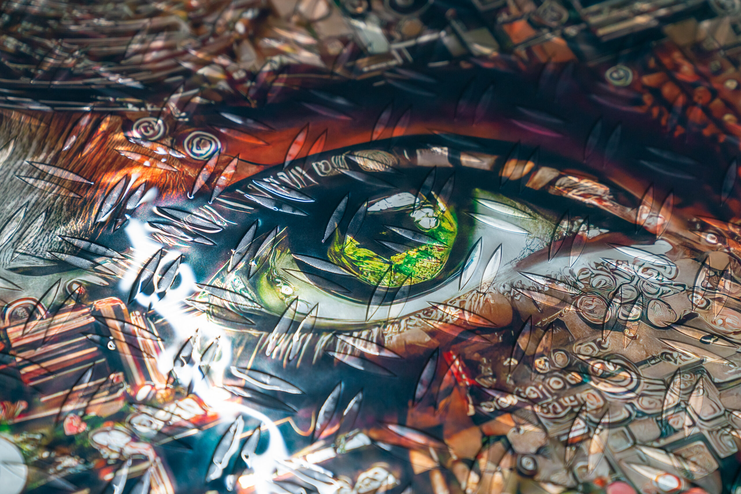 As Ayana graces the wall, the delicate green leaves cascading around her form a seamless convergence of the organic and the digital, evoking a sense of harmonious balance. The checker plate aluminum substrate adds a dynamic texture to the artwork, enhancing the interplay of design and materiality. The meticulous detailing in Ayana’s skin, particularly on her cheeks and forehead, showcases Raats’ unparalleled skill and attention to detail, resulting in a truly breathtaking and immersive experience.