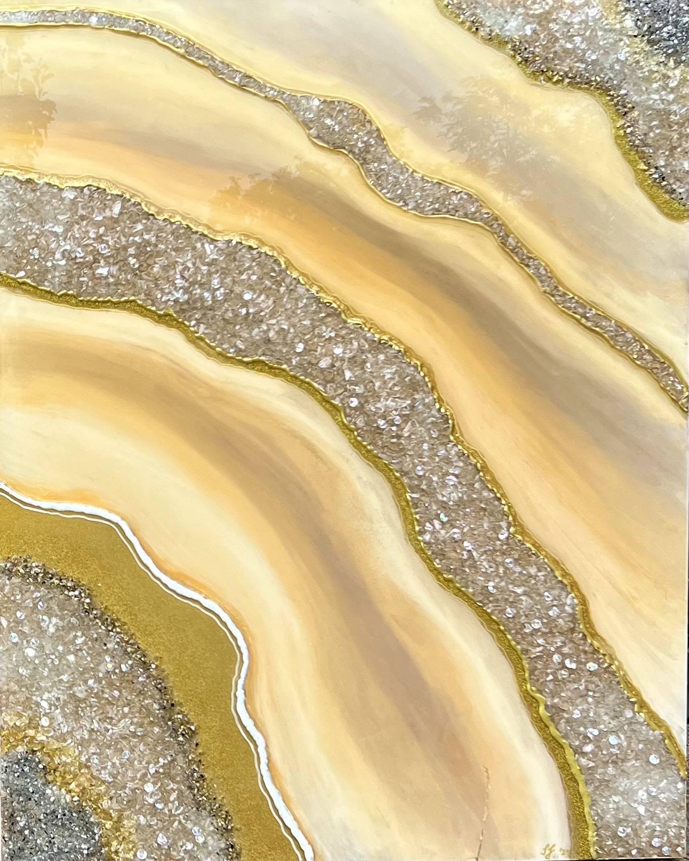 Citrine Diptych – Right Panel is a luminous and elegant artwork that radiates warmth and harmony. Created with glossy resin and shimmering crystals on a wooden base, its soft golden and light brown hues reflect the natural beauty and energy of citrine, a stone associated with abundance and positivity.