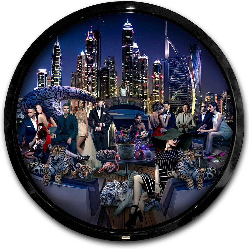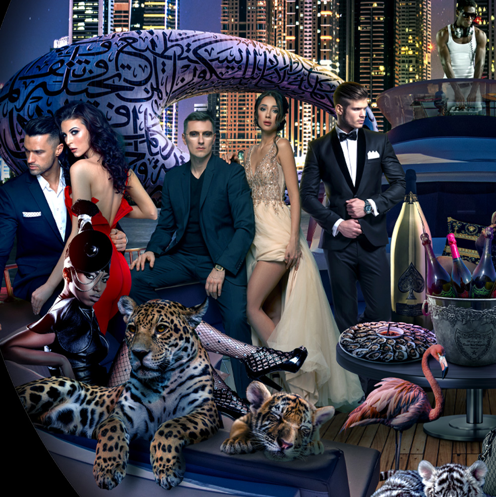 In this enthralling masterpiece, the canvas unfolds on a luxurious superyacht gracefully navigating the crystalline waters of Dubai. It paints a vivid tableau of an exclusive high-end soirée, a gathering reserved solely for the echelons of millionaires. The ambiance permeates opulence and extravagance, as the privileged guests immerse themselves in a world of unabashed indulgence and unparalleled luxury.