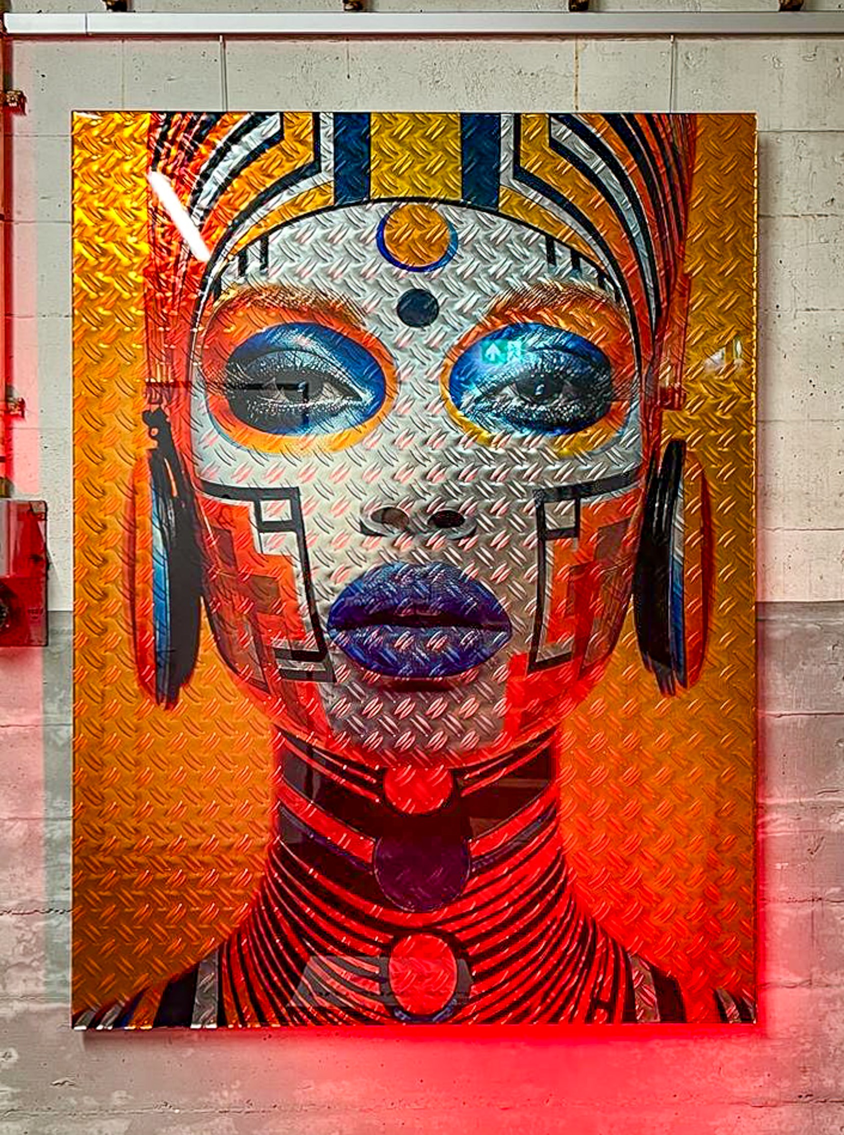 Printed on a diamond plate surface, Zara takes on a unique and striking appearance. The diamond plate adds a layer of intricacy and texture to the artwork, enhancing its visual appeal. The use of beautiful and vibrant colors further elevates the piece, creating a visually stunning composition that captures the eye and sparks the imagination.